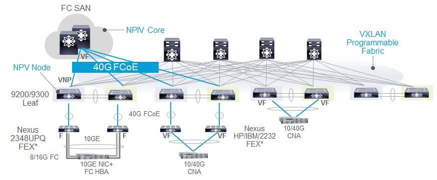 Typically, Nexus 9K is used in spine/leaf architecture, and the new FCoE enhancements enable seamless connectivity from 9K leaf (typically the Cisco Nexus 9200 or Nexus 9300) to Cisco MDS 9000 SAN – enabling transparent connectivity from the access to the SAN core.