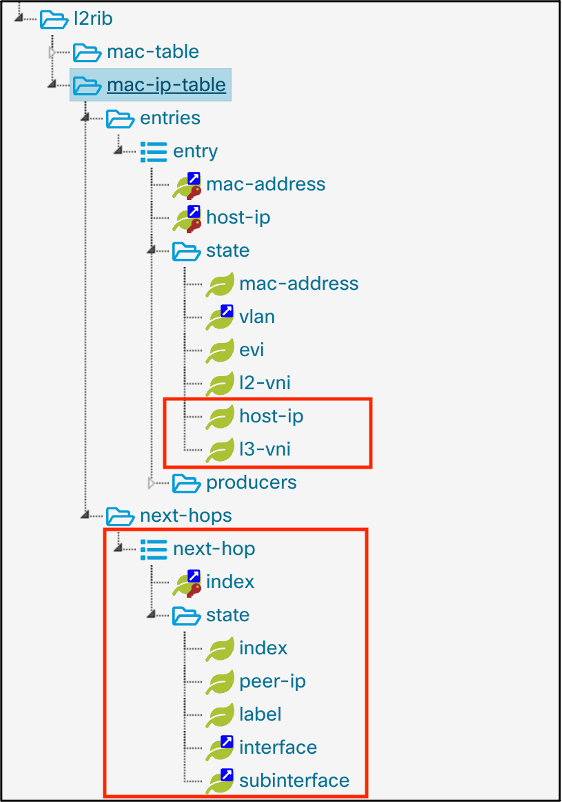 In addition to these enhancements within the L2RIB, there are also additional enhancements within the L2VPN container of the BGP Address Family Indicator/ Subsequent Address Family Indicator (AFI/SAFI) network instance, which together provide deep visibility into the overall state and routing of a Cisco NX-OS BGP EVPN fabric.