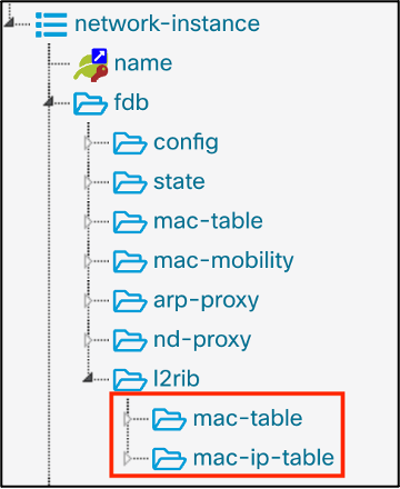 Within the existing OpenConfig network-instances model, an EVI and associated constructs are now part of the existing network-instance/fdb hierarchy. The enhancements Cisco contributed to the l2rib container consists of a new container within the parent Forwarding Database (FDB) container. The L2RIB has 2 primary containers, the MAC table and the MAC-IP table as shown in Figure 1.