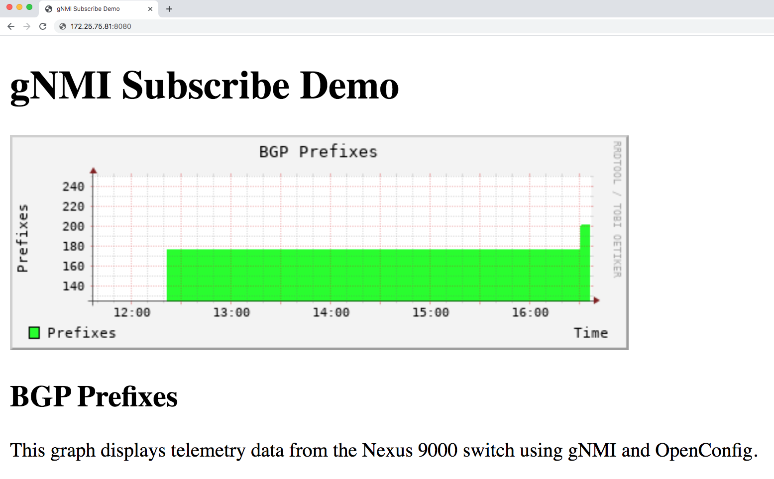 The xpath above is used to access the data using the OpenConfig model openconfig-network-instance. The example script is set up to stream this value every 10 seconds in the SAMPLE mode, but can also be set up with the ON_CHANGE mode. Once we receive the data and format it in JSON, we feed this telemetry data to a custom-built collector. As seen in the example script, with just a few lines of code, we are able to build our own database and graph the telemetry data onto it. The custom-built collector shown below uses the rrdtool Python module to create a time-series round robin database. We use the values stored in the database to generate a graph in PNG format that plots the telemetry data. The graph is rendered in a html page using lighttpd. We stream telemetry data from the Nexus 9000 Series switch and see that total the number of BGP prefixes goes from 175 to 200 as we inject more routes.