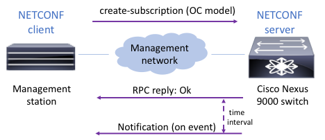In terms of NETCONF support, Nexus 9000 switches support various operations with device YANG and OpenConfig models. NETCONF Event Notifications is a new mechanism available on Nexus 9000 Series switches by which a NETCONF client can subscribe to system events from a NETCONF server (switch) and continue to receive them asynchronously as long as those events are generated, without having to do periodic polling. This is similar to functionality offered by Syslog or SNMP traps, but the events are generated upon changes in the YANG model tree (device YANG or OpenConfig model tree). NETCONF notifications were first supported on NX-OS 9.3(1) with device YANG models. The latest NX-OS release 9.3(5) adds support for OpenConfig models with NETCONF notifications.