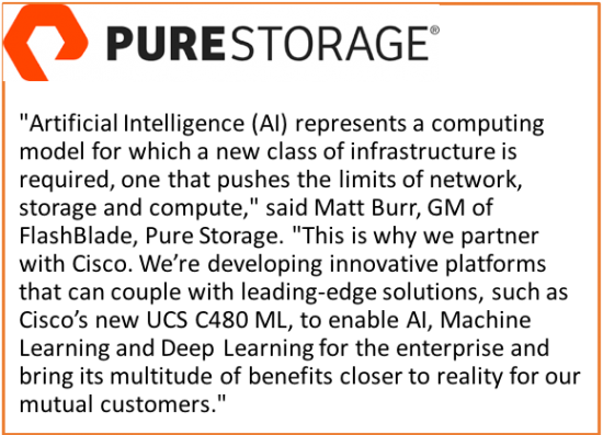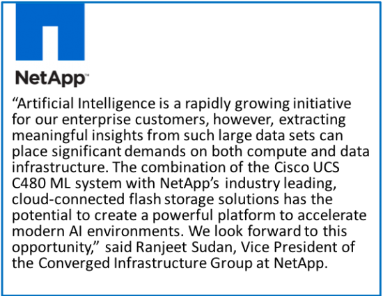 For the past several years, Cisco has been working with big data software partners such as Cloudera, Hortonworks and others to help customers integrate data sources into UCS based data lakes and gain insights from their data through contemporary data analytics techniques. We continue to work with these partners so customers can easily incorporate AI/ML methods into these analytics environments as well as connect these data lakes to deep learning infrastructure. Further, we are demystifying this complex ecosystem and reducing risk, with Cisco validated AI/ML solutions, that combine a broad set of technologies and applications to help ensure a faster, more reliable, and predictable deployment. In parallel, we are also easing the move towards containerization of apps and multicloud computing models. To that end, Cisco has contributed code to the Google open source project, Kubeflow, which integrates TensorFlow with Kubernetes. Cisco is also working with Anaconda to ensure that data scientists have a ready programming environment, a set of curated libraries and models, and a training and deployment environment. However, software alone is half the story – the hitherto missing ingredient, we are bringing to market are validated and optimized stacks on our next-gen C480 ML infrastructure platform.