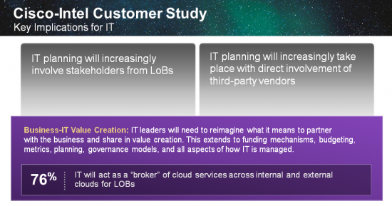 In a wide-ranging study, Cisco, in partnership with Intel®, sought to pinpoint just how these powerful trends are impacting IT. The “Impact of Cloud on IT Consumption Models” study surveyed 4,226 IT leaders in 18 industries across nine key economies, developed as well as emerging: Brazil, Canada, China, Germany, India, Mexico, Russia, United Kingdom, and the United States. The study supports our point of view. Up to 76% of the survey respondents signaled that IT will act as a “broker” of cloud services across internal and external clouds for LoBs.