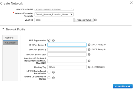 For ease of deployment, DCNM provides a “Propose VLAN” option that provides the next available VLAN not being used across all switches within a fabric; this in turn can be mapped to a new Network. Similarly, when multicast is chosen as an option to carry BUM traffic within a given fabric, DCNM manages the user-defined multicast pool and provides flexible options of mapping multicast groups to networks and VRFs. Various configuration knobs are available that can be incrementally added/edited post network creation and/or deployment. These include features such as ARP suppression, IPv6 enablement, secondary gateway IPs, DHCP relays, Tenant Routed Multicast, VXLAN OAM etc.