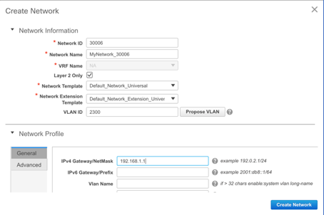 DCNM allows users to create a Layer-2/Layer-3 Network and its associated VLAN, VRF and VNI, using out-of-box best practice templates. A Layer-2 network can be incrementally migrated to Layer-3 by mapping that Network to an appropriate VRF. DCNM automatically deploys a VRF to a switch when a Layer-3 network associated with that VRF is deployed to that switch. Appropriate references and states are maintained on a per switch, per network and per VRF basis.