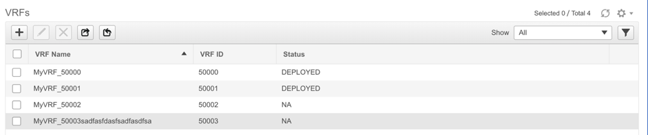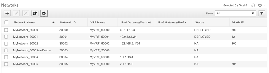 In addition to the web-based user interface and REST APIs, DCNM also supports bulk creation of networks and VRFs via a csv file import option with pre-defined overlay network and VRF definitions. To keep changes at hand, all network/VRF definitions including their current and historical deployment status, are available as a report.