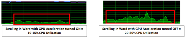 Try it out yourself with this simple test. Open Task Manager and Word, let your system come to idle, then start scrolling up and down and watch your CPU utilization. Then go into Options/Advanced and check the box that says “Disable Hardware Graphics Acceleration” under Display. See the difference in simple scrolling in a word document?
