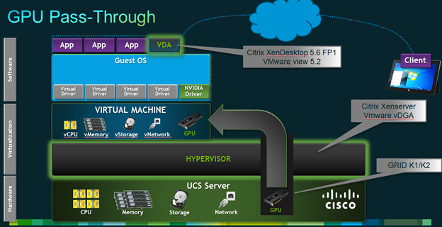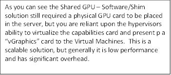 - Pass-through allows full performance and card features, but it is literally a 1 to 1 mapping of user to GPU = not very scalable