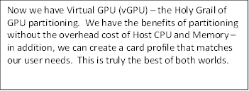 You might be thinking that this is easy – I’ll just grab these GRID cards and start using vGPU since its leaner, meaner and has full card capabilities than Software/Shim and it can scale better than Pass-Through. If it were only that simple – lets take a closer look all modes: