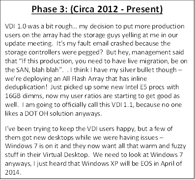 So it looks like everything is good? We’ve witnessed the humble beginnings of putting desktops on a hypervisor and we’ve even got to the point that it’s almost cost feasible to do this! The past several years our VDI Administrator has struggled to get Windows XP tweaked and tuned to be lean, mean and efficient with their hardware. It has taken a couple of different storage solutions, compute configurations to get to the point that everything seems really, seriously, ready for production to most of the users in the organization. Well our VDI Administrator is about to find out that something is drastically different.
