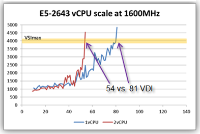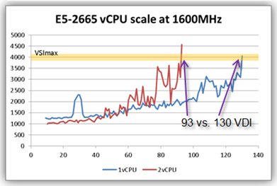 Now look at the impact to the E5-2665 system. With 1vCPU, the E5-2665 system scaled to 130 virtual desktops before exceeding the VSImax. The same system only scaled to 93 virtual desktops when configured with two vCPUs (a 40% decrease in scale).