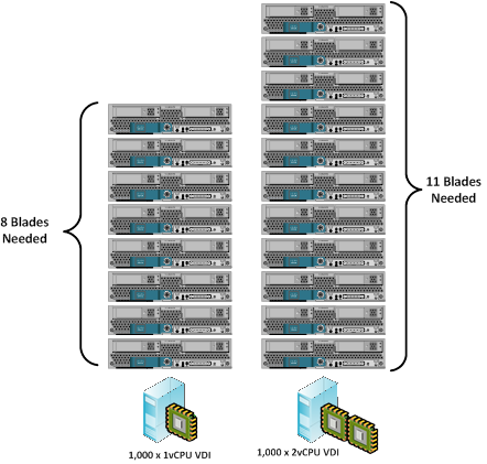 Just a quick example – if you were going to deploy 1,000 Virtual Desktops on the B200 M3/E5-2665 system we looked at. A single vCPU deployment would require 8 blades without redundancy. If you needed/wanted to use 2vCPU’s on each VM, you would need 11 servers without redundancy. 3 more servers doesn’t sound like much, but it is a 37.5% increase in the compute infrastructure needed!