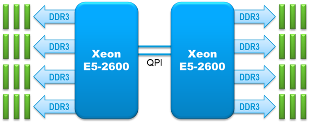 The situation. As you can see in the 2-socket block diagram below, the E5-2600 family of processors has four memory channels and supports three DIMMs per channel. For a 2-socket blade, that’s 24 DIMMs. That’s a lot of DIMMs. If you populate either 8 or 16 DIMMs (1 or 2 DIMMs per channel), the memory bus runs at the full 1600MHz (when using the appropriately rated DIMMs). But when you add a third DIMM to each channel (for 24 DIMMs), the bus slows down. When we performed this testing, going from 16 to 24 DIMMs slowed the entire memory bus to 1066MHz, so that’s what you’ll see in the results. Cisco has since qualified running the memory bus at 1333MHz in UCSM maintenance releases 2.0(5a) and 2.1(1b), so running updated UCSM firmware should yield even better results than we saw in our testing.