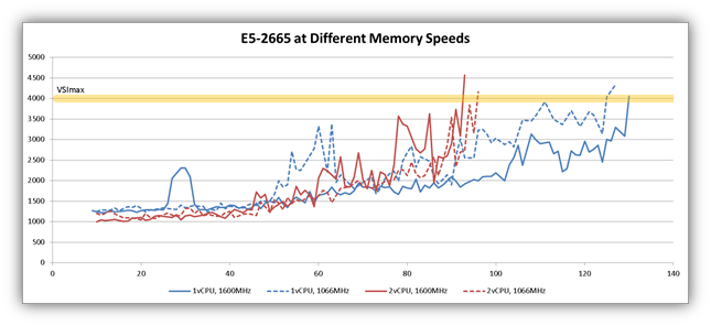 Looking at the red lines now (2vCPU desktops), we see that the system with the slower memory bus speed achieved greater density by about 3%. Is it significant that the system with the slower memory bus achieved greater density? Nah. Again, 3% is negligible for a random workload. Both the red and blue curves show that overall density is not significantly impacted by a change in memory bus speed from 1600MHz to 1066MHz (a 33% reduction in speed).