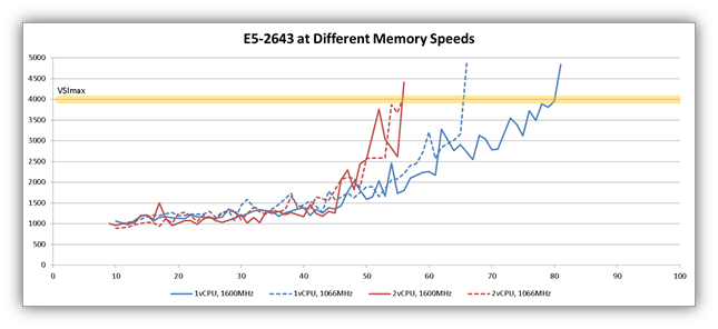 Looking at the blue curves (1vCPU), there is actually a dramatic difference in density of 23%. It appears that the E5-2643 (which has half as many cores as the E5-2665) is more sensitive to memory speed changes. Keep in mind that these tests are taxing the E5-2643 with a much higher vCPU/core ratio (given that it has half as many cores).