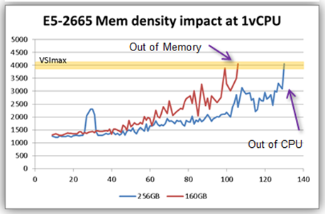 Numbers! In our testing we found that the E5-2665 B200 M3 could support 130 x 1vCPU desktops with 1.5GB each before it ran out of CPU and not memory. If we factor in the overhead, we can confirm this by this simple calculation: 200MB (ESXi) + 130 Desktops x (1.5GB + 29MB)= 203,650MB or 198.89GB of potential consumed memory. On our test with 256GB of RAM running at 1600MHz, we were nowhere near running out of memory space – CPU bottleneck confirmed.