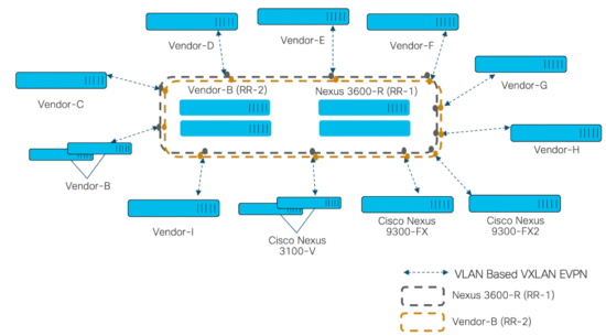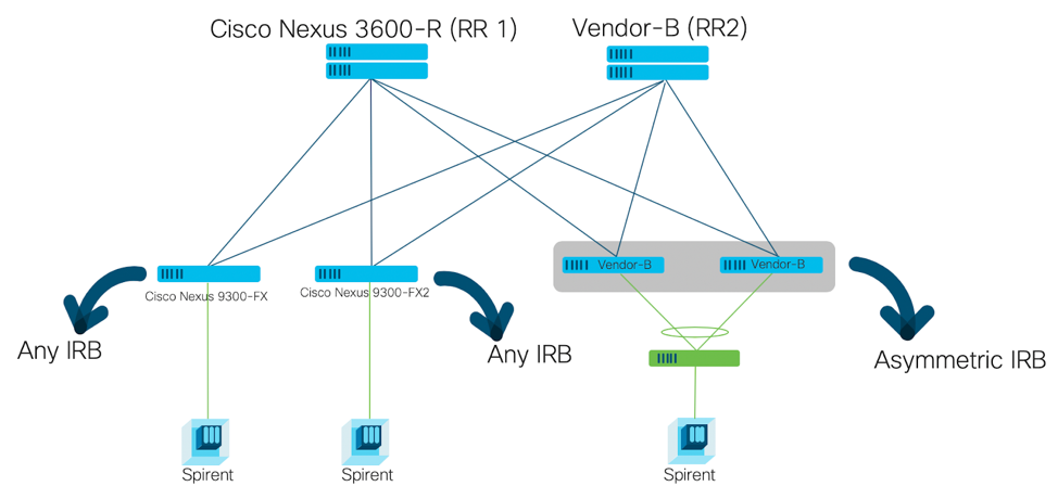 The widely deployed Cisco Nexus 9300 conducted the majority of the test scenarios. There specifically the Cisco Nexus 9300-FX and Nexus 9300-FX2 were acting as Device Under Test. For the Nexus 3000-Series we conducted multi-vendor testing around EVPN Active-Active Multihoming (Nexus 3100-V) and BGP Route Reflector capability and scale (Nexus 3600-R).