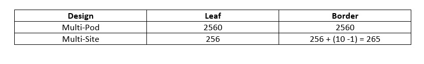 What this means is that if there are N=10 sites with M=256 leafs (VTEPs) each, the number of VTEPs each leaf needs to know about significantly reduces with an EVPN Multi-Site deployment as listed below: