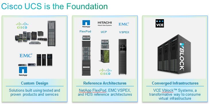The VSPEX, FlexPod and Hitachi UCP are reference architectures which provide validated and tested designs for typical use cases. Customers now do not have to experiment with the individual infrastructure elements. They can choose any of the validated designs depending on needs.