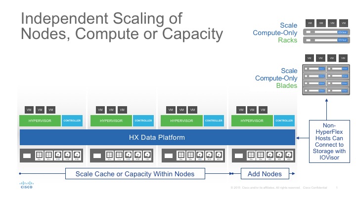 Cisco HyperFlex provides the unique ability to truly scale resources independently. When you need to scale just compute, for example in non-persistent VDI deployments, you can simply add UCS blades or racks that join the hyperconverged resources as compute-only nodes. This is done with our IOvisor, a VIB that provides a network file system (NFS) mount point to vSphere, effectively adding these servers to the unified pool of available resources. You don’t have to pay the high cost of disks and software in additional nodes, significantly lowering your overall TCO by truly adapting resources to the needs of your specific environment.