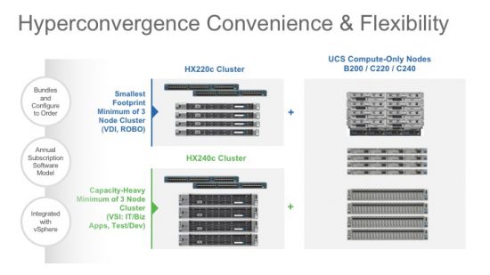 One of the benefits of running on the same UCS platform is that you can leverage existing assets in the your datacenter. Continuing the example of expanding the hyperconverged cluster, you can grab an existing UCS B200, C220 or C240 and add them as compute-only nodes. Once the VIB is deployed, these compute-only nodes become part of the joint pool.
