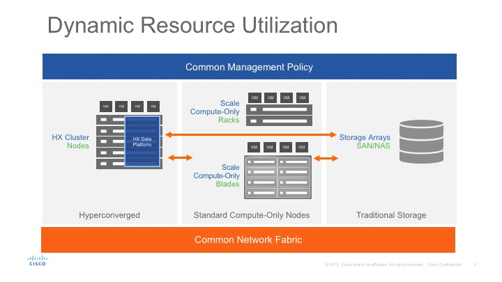 Another key aspect of this model is the ability to shift these resources across Hyperconverged (HCI) and converged or traditional infrastructure. The compute-only nodes can be used to support the hyperconverged cluster, and based on seasonal or daily application demands they can also be shifted to support your traditional infrastructure, providing true cloud-like agility across your datacenter.