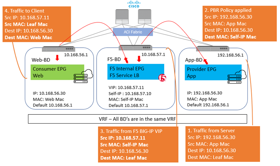 In Step 2 when the traffic is returned from the client, ACI uses the Self-IP and MAC that was defined in the L4-L7 redirect policy to send traffic to the BIG-IP.