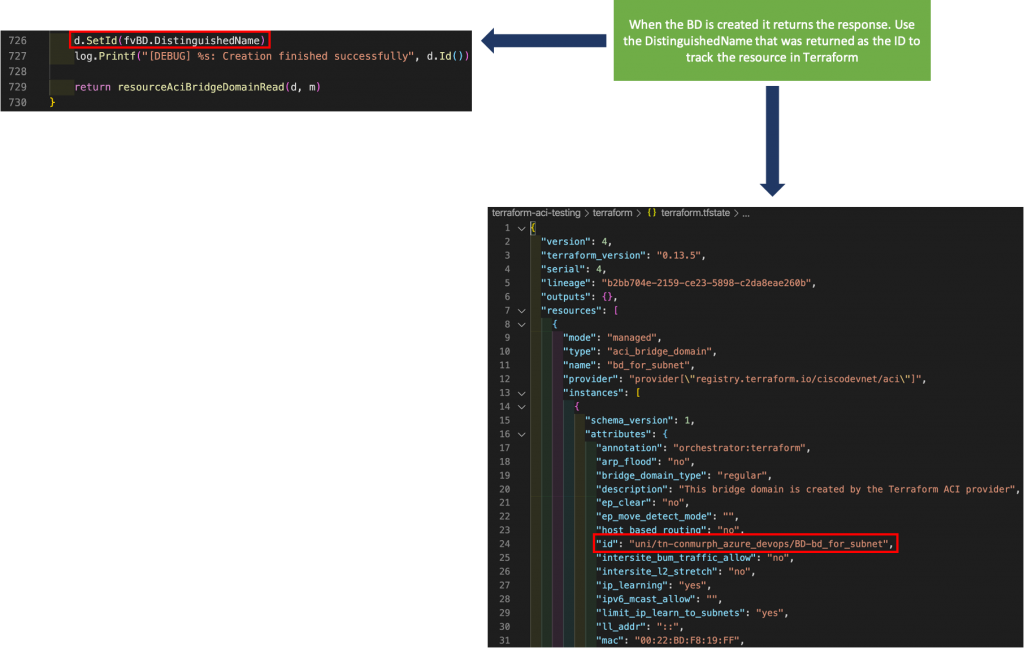 Continuing down towards the end of the create function you’ll see the ID being set on line 726. Remember when Terraform manages a resource it keeps the state within the terraform.tfstate file. Terraform tracks this resource using the id, and in the case of ACI the id is the DistinguishedName.