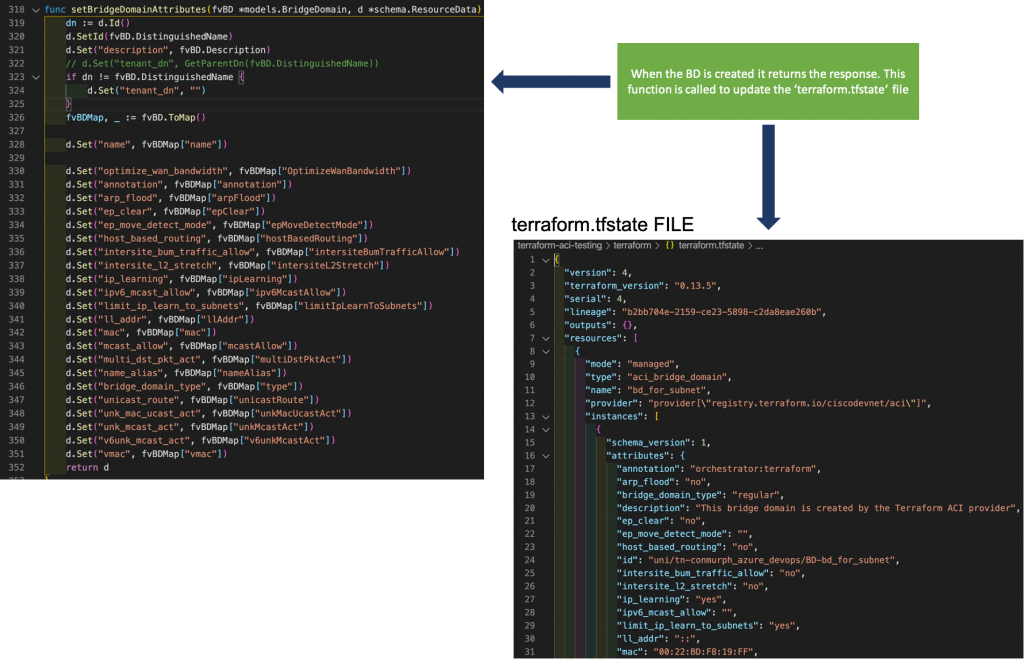 It’s not only the id that Terraform tracks though, all the other properties for the resource should also be available in the state file. To save this data there is another function, setBridgeDomainAttributes, which sets the properties in the state file with the values that were returned after creating/updating the resource.