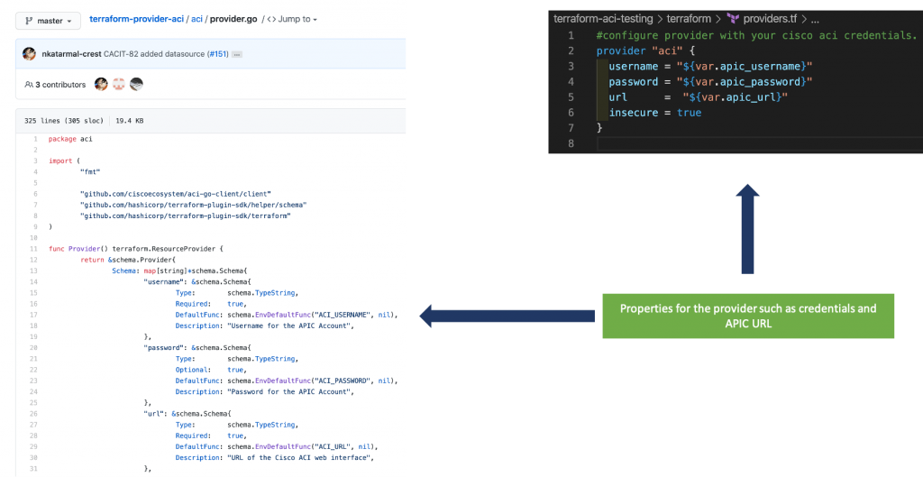 Within the ACI folder you’ll find a file called “provider.go“. This is a standard file in the Terraform providers and is responsible for setting the properties such as username, password, and URL of the APIC in this case.