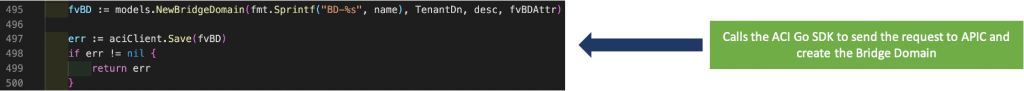 Further down in the file you’ll see the ACI Go SDK is called to create a NewBridgeDomain. This object is then passed to a Save function in the SDK which makes a call to the APIC to create the bridge domain