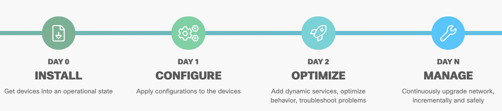 DevNet Automation Exchange is a community-based developer center where our networkers and developers can learn to Walk, Run, and Fly with Network Automation, using Cisco’s products and the full capabilities of the new network. They are defined as follows: