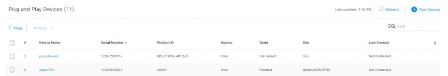 These steps are seen in the UI. The first device (“pre-planned”) has been added to DNA Center, but not claimed. The second device was added and claimed to a site. The source of both devices was “User” which indicates they were pre-planned as opposed to “Network” which indicates an un-planned device.