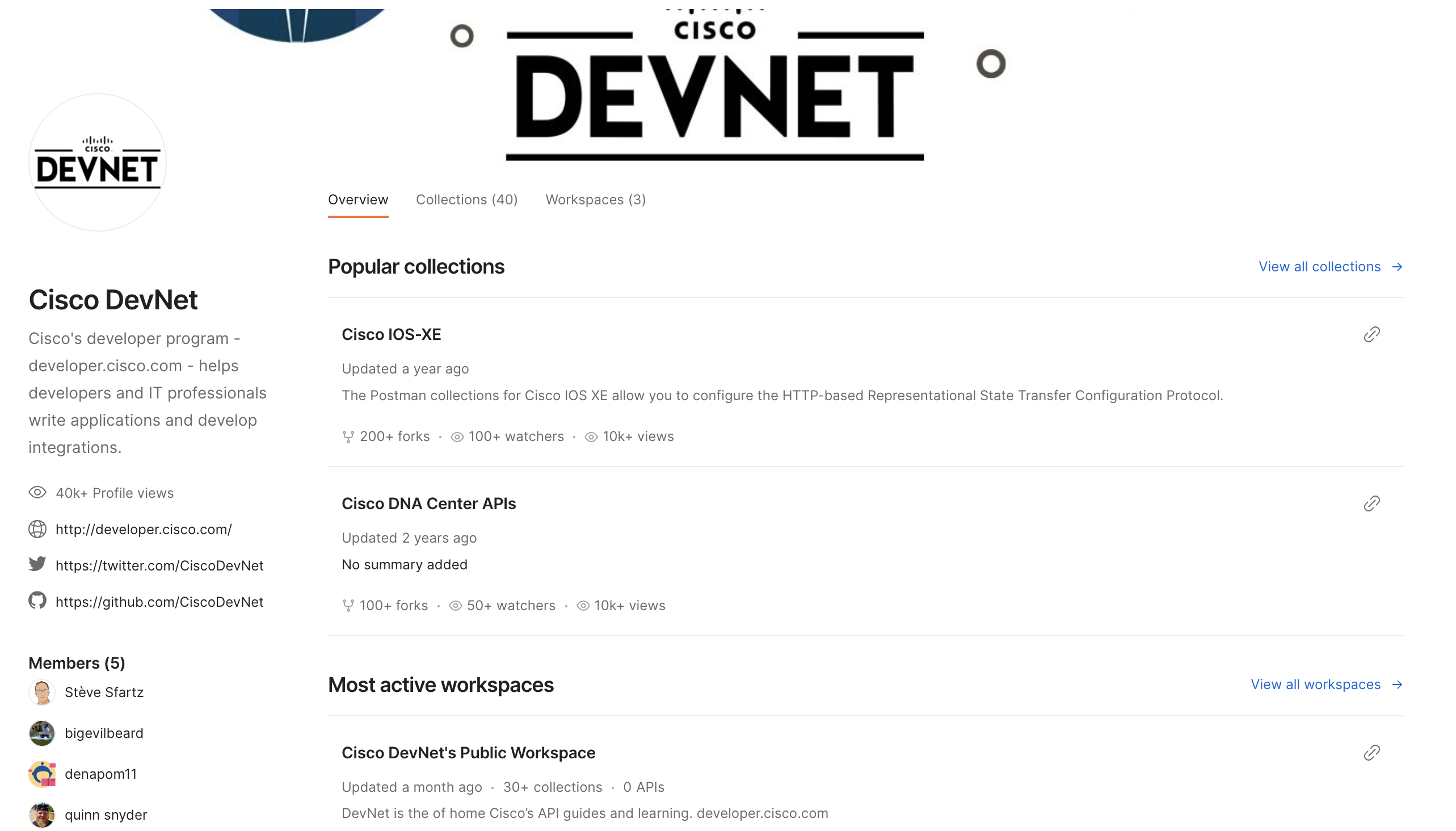 Here at Cisco, our Developer Experience team has been collaborating with Postman since the early days of DevNet in 2017. We appreciate what Postman offers and how it has played a significant role in helping educate and inspire our developer community and our business partners. The tool has enabled our team to build interactive educational materials, like our Coding & API Learning Labs, to help people quickly get hands-on with our own APIs. Thanks to Postman, developers and customers can get more value from Cisco APIs quickly, and can solve business problems efficiently.