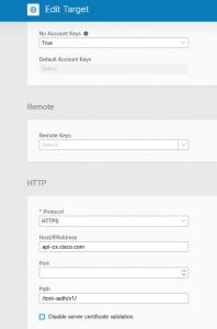 NO ACCOUNT KEYSto true. SetPROTOCOLto HTTPS,HOST/IPto api-cx.cisco.com andPATHto /torii-auth/v1/. You can see all of these values in the Python script as well. ClickSUBMIT.