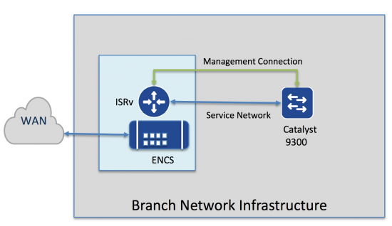 This blog shows the automated deployment of physical and virtual network devices in a branch. Automation is used to deploy the network functions (ISRv router) on an ENCS 5400 and Plug and Play is used to configure the 9300 switch. Other models could also be used.