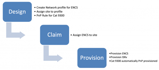 DNA Center provides the automation tools for this deployment. There are three main steps illustrated below: