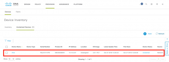 This example assumes a new ENCS device has been connected to the WAN, and it is able to discover DNA Center. It will appear as an unclaimed device under the provisioning workflow. Provision -> Unclaimed Devices