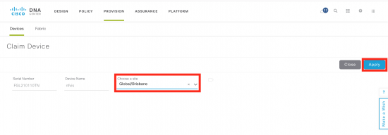 Next step is to select the nfvis device (nfvis is the default name for the device), and claim it. All that is required is a site, in this example “Brisbane”. Click Apply.