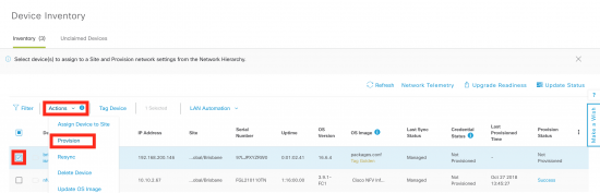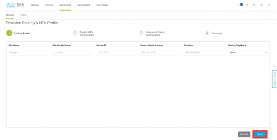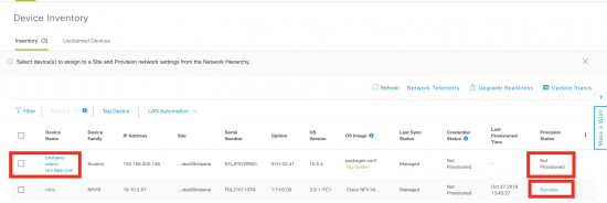 - Once the device is assigned to a site, it can be provisioned. This step places any device specifc settings (for example interfaces). Most of this information has already been defined in the design, so cannot be changed. The ISRv is also provisioned, but there is very little to change. Once the WAN services are up, the Catalyst 9300 automatically uses PnP to obtain it’s configuration.