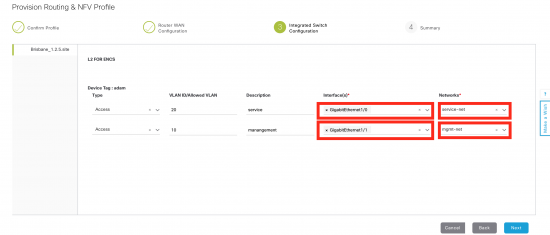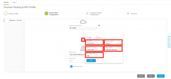 Step 2 (router WAN) is where the WAN interface for the ISRv is done. Click on the small circle that links the ENCS to the WAN. Then fill in details for the IP address, WAN interface on ENCS, and bandwidth.