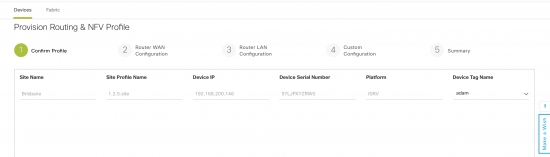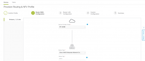 Select the type as “Routing & NFV”. The first step will be to choose the type of device and the WAN connections. Service Provider Profile is defined under Design -> Network Settings -> SP Profiles.
