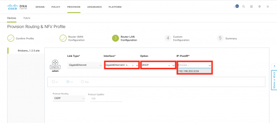 Step 3 is the Router LAN configuration. In this deployment, the router has a layer three connection (routed, OSPF) to the downstream Cat 9300, so this is not really required. In this case Gig3 appears in the dropdown menu as it has a “LAN” tag. Just select DHCP and the single address pool. These come from the ENCS configuration.