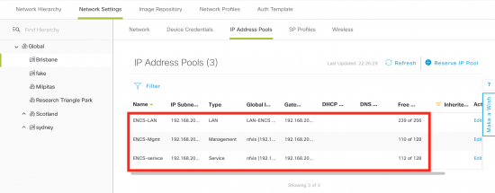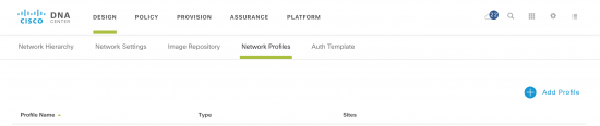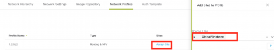 - Design phase. This is where IP address pools, site specific settings like credentials, DNS, AAA are defined. In addition a network profile is defined, which include the “design” of the ENCS network functions and their internal network connectivity. Finally, the network profile is mapped to one or more “sites.” Site hierarchy is also defined in this phase.