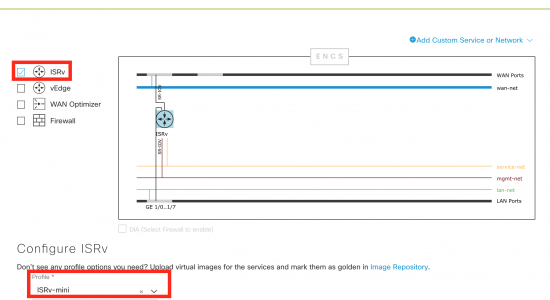 Editing services is where you add the VNF (ISRv) and configure the internal networking. Make sure you have uploaded an ISRv image into the image repository first, so you can chose the VNF profile for the ISRv.
