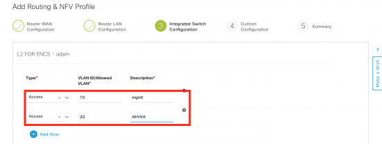 Step 3 is the Integrated Switch configuration. ENCS has built in switch with up to eight ports. In this example there are internal networks map to the two vlans. In this example, vlan 20 (service) is mapped to the service-net on ISRv and exposed on interface GigabitEthernet1/0 on the ENCS switch. Similarly, vlan 10 mapps to mgmt-net and interface GigabitEthernet1/1 on the ENCS switch.