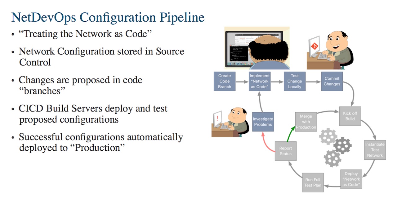 Which brings me to my hands on NetDevOps workshops for CLEUR. In DEVNET-1365: Vagrant Up for the Network Engineer and DEVNET-2203: Build a Network Configuration CICD Pipeline we’ll be getting hands-on with some real innovative approaches and techniques for network programmability. We’ll be learning how we can work just like software developers with live developer environments directly on our laptops with Vagrant, and then turn around and watch how Continuous Development practices can make our network configurations act like modern applications.