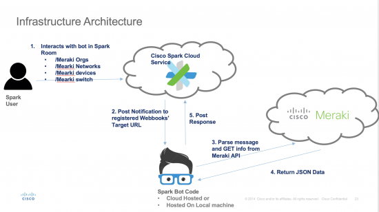 Our focus is mainly on the part labeled “Spark Bot Code”. The python file in the link above (botmeraki.py) should be accessible through a public web server of your choosing (for this I used the native python webserver) because Cisco Spark will have to send a webhook to it on the /message event (e.g. someone types a message into the room in which the bot is included). But first, we have to register the bot!