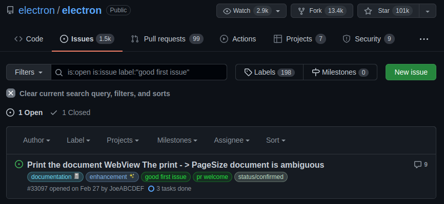 Finally, many maintainers take the time to mark specific issues as being better for new contributors. For example, the Electron project applies a “good first issue” label. Notice the “Labels” selector on GitHub. You can use this to filter, showing you the best issues to start with.