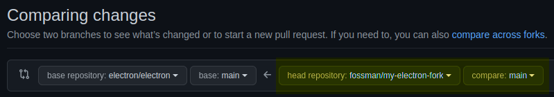 First, select the desired branch that the code changes will merge into. Typically this will be the main branch in the original repository, but be sure to check the contributor guidelines.